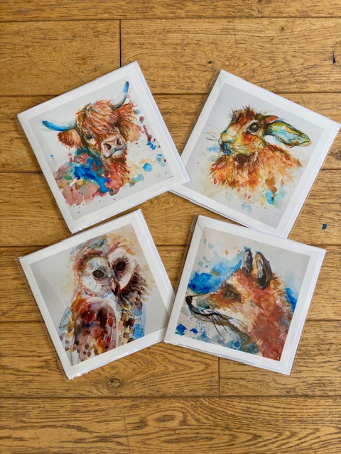 Animal Card Designs – Set 1, 4 different Scottish animals cards including a hare, highland cow, fox and owl, from the images of Caroline’s paintings, £12.