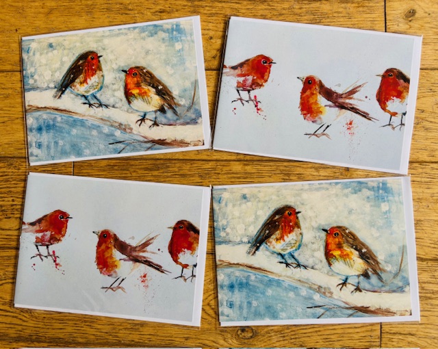 Animal Card Designs – Set 2, Winter Robins, from the images of Caroline’s paintings, 2 designs, pack of 4 cards, £12.