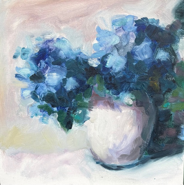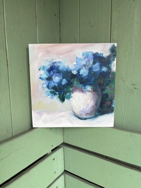 ‘Blue Hydrangeas in a Vase’, oil on canvas, 26cm x 26cm, unframed, £80 plus postage or free local delivery or studio collection.