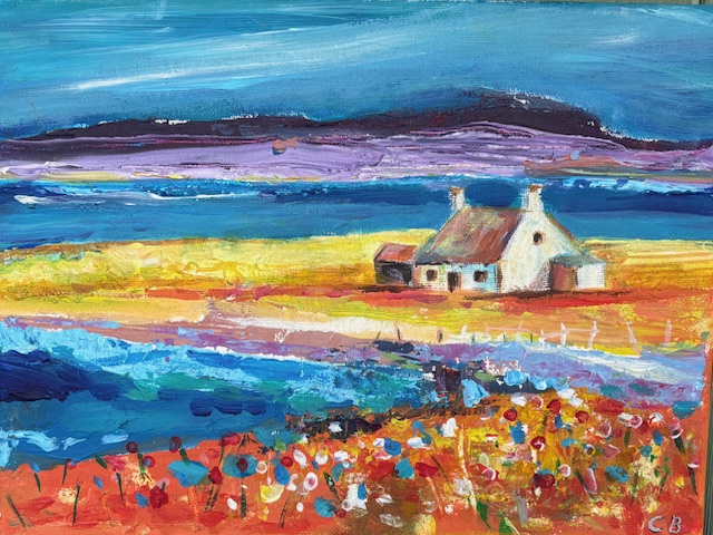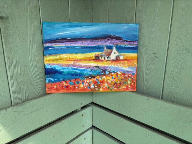 ‘Highland Cottage’, acrylic on canvas, 36cm x 23 cm , unframed, £100 plus postage or free local delivery or studio collection.