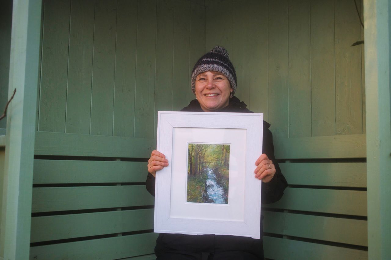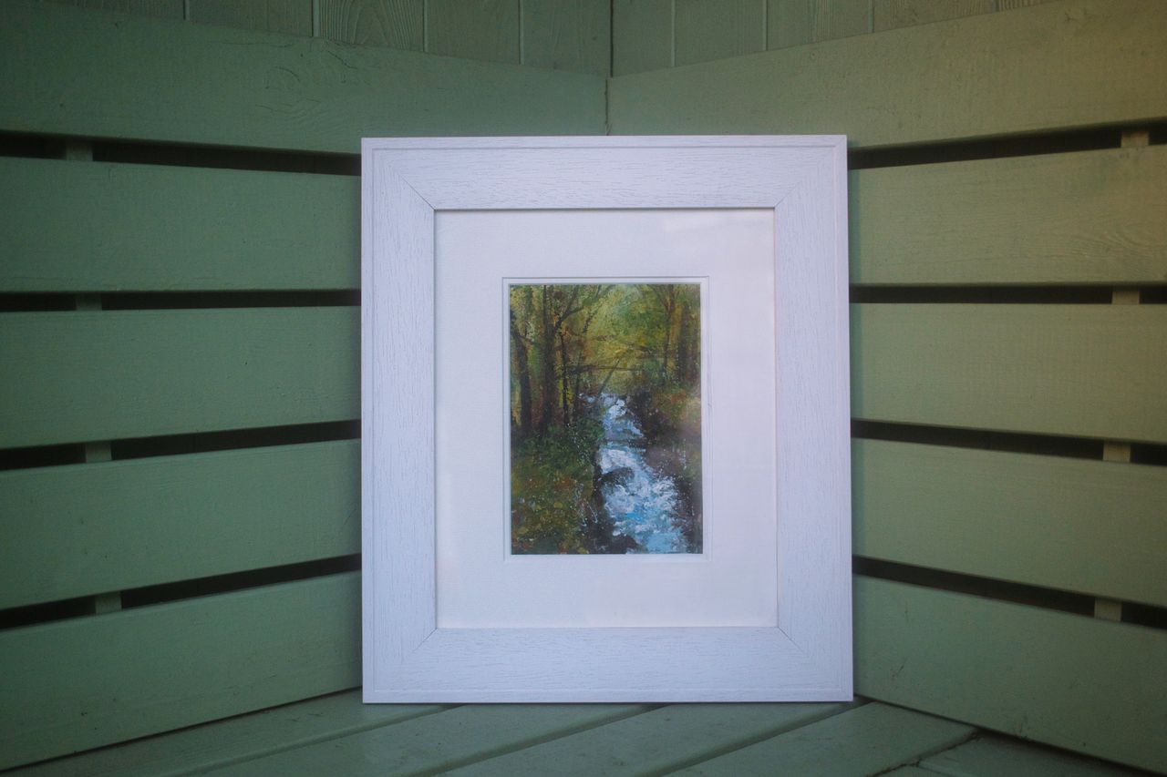 ‘Meandering Stream, Rouken Glen, Acrylic on board, 44cm x 39cm including professional white frame, £260