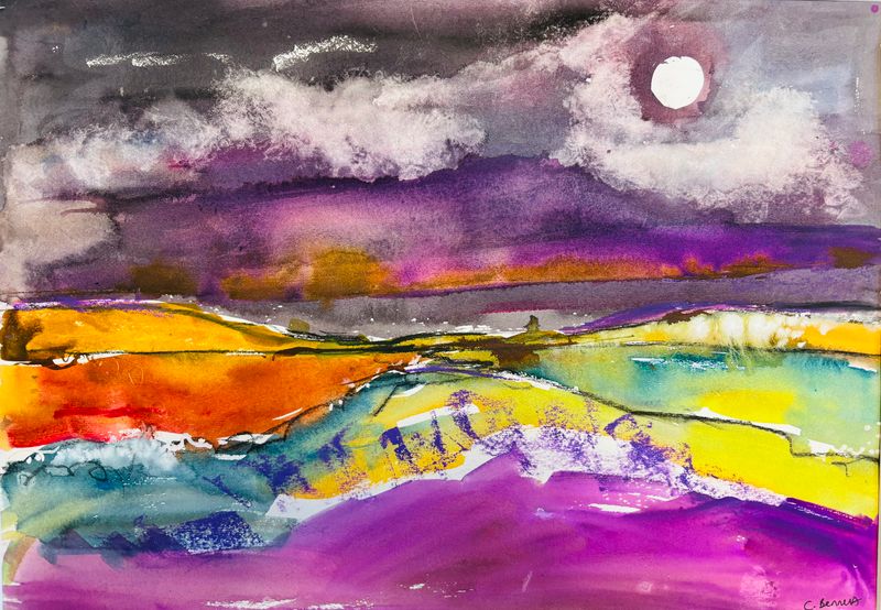‘Pink Field, Galloway’, Ink and mixed media on paper, 46cm x 61cm including Professional white frame, £300 plus postage or free local delivery or collection from studio.