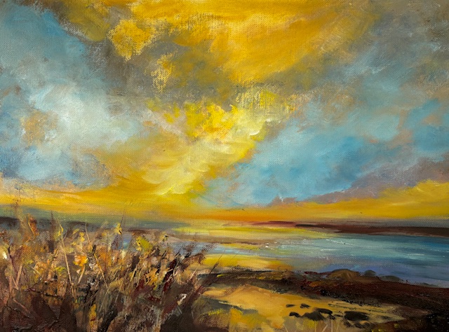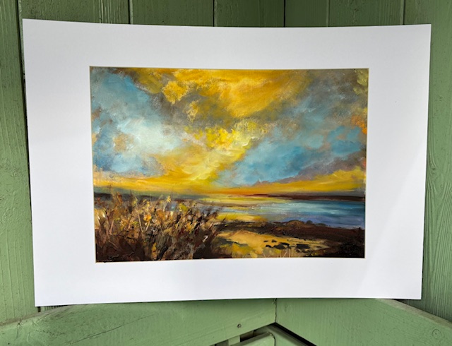 ‘Troon, late summer skies’, oil on paper, mounted to A3 Size. £70. Free Collection from studio or Postage additional cost.